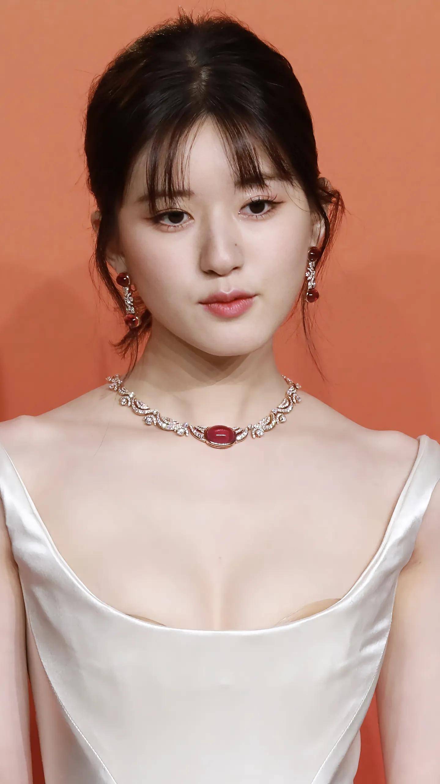 赵露思白色吊带礼服长裙红色珠宝钻石首饰穿搭怼脸拍 ,身材真绝了!