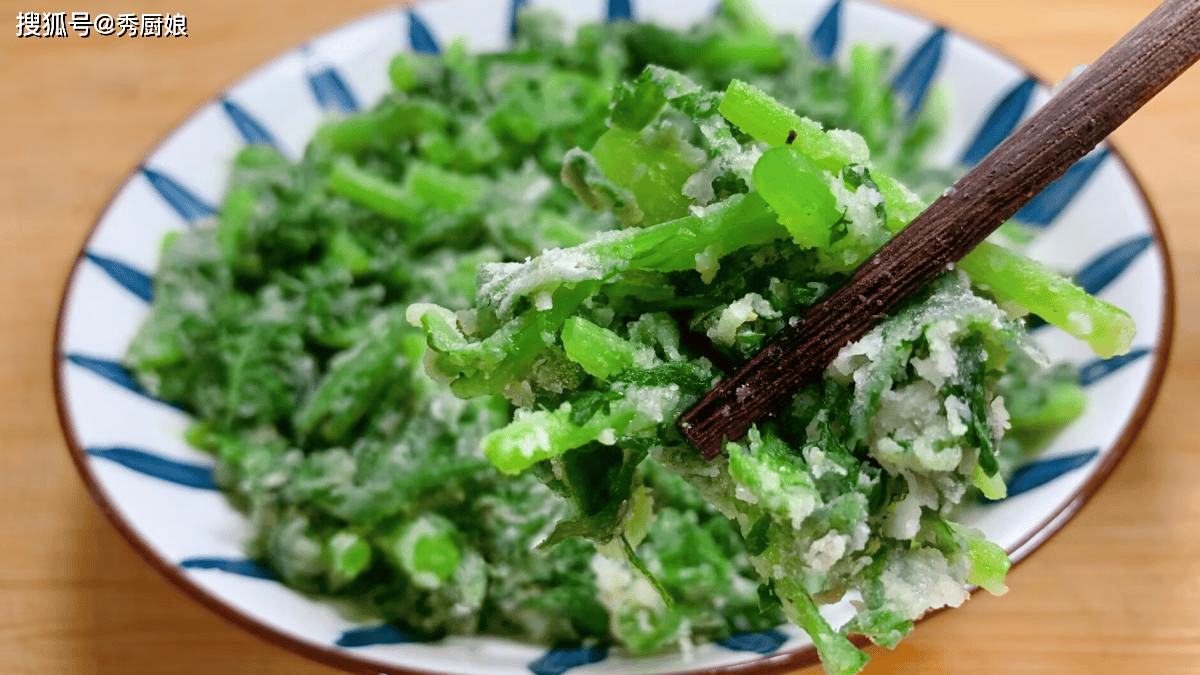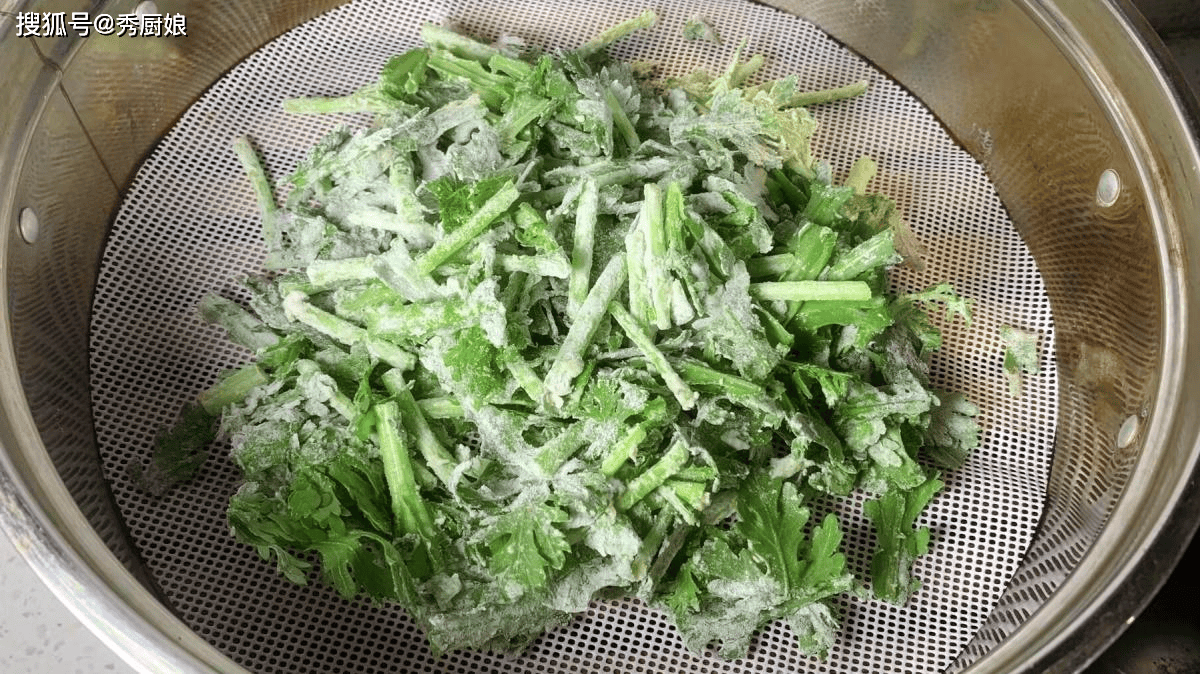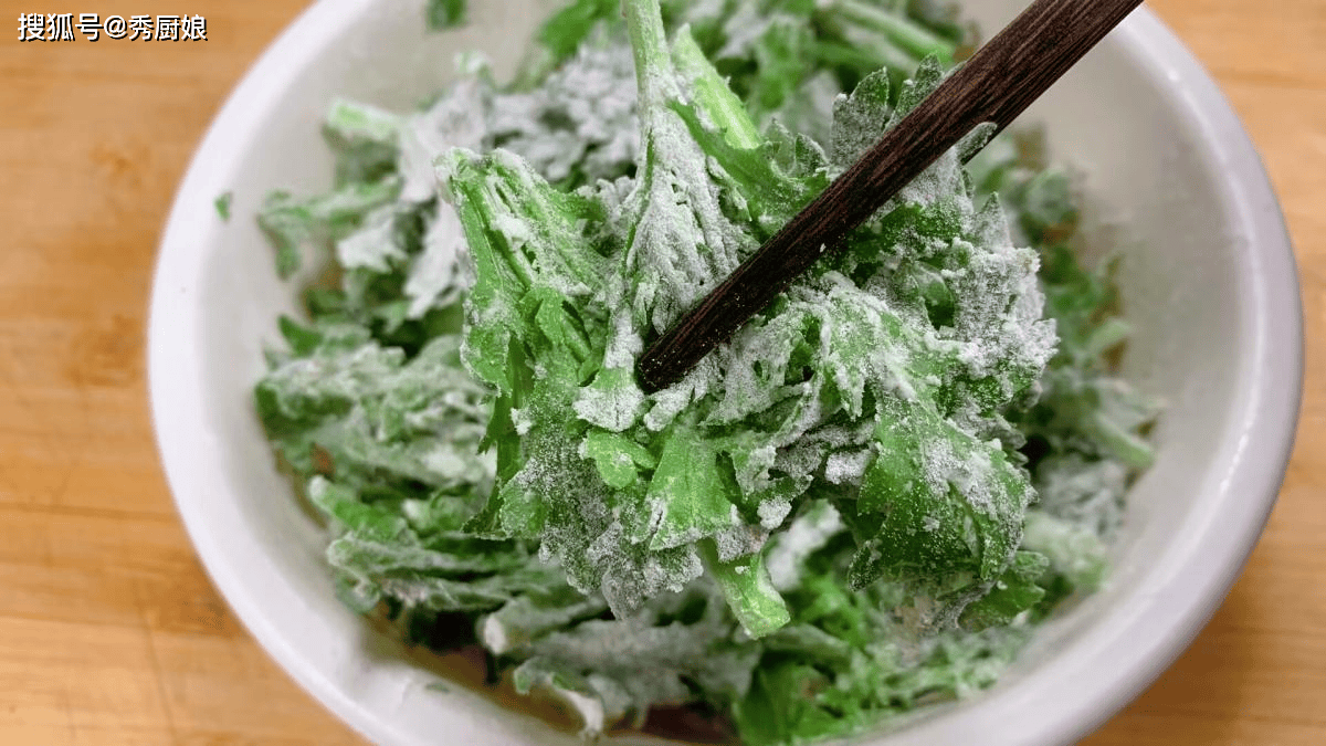 第二步:把沥干的茼蒿放进一个大盆里,先淋上少许熟油(或者味道淡的玉米油、葵花籽油),轻轻抓匀。这层油膜能锁住水分,同时防止粘连。然后,少量多次地撒入玉米面粉(也叫棒子面)和普通面粉,比例大概2:1。边撒边用双手像“颠簸箕”那样颠匀,确保每一根茼蒿都均匀地裹上一层薄薄的“粉衣”。切记不要多,像给茼蒿穿上一层轻纱即可,太多就成了面疙瘩。