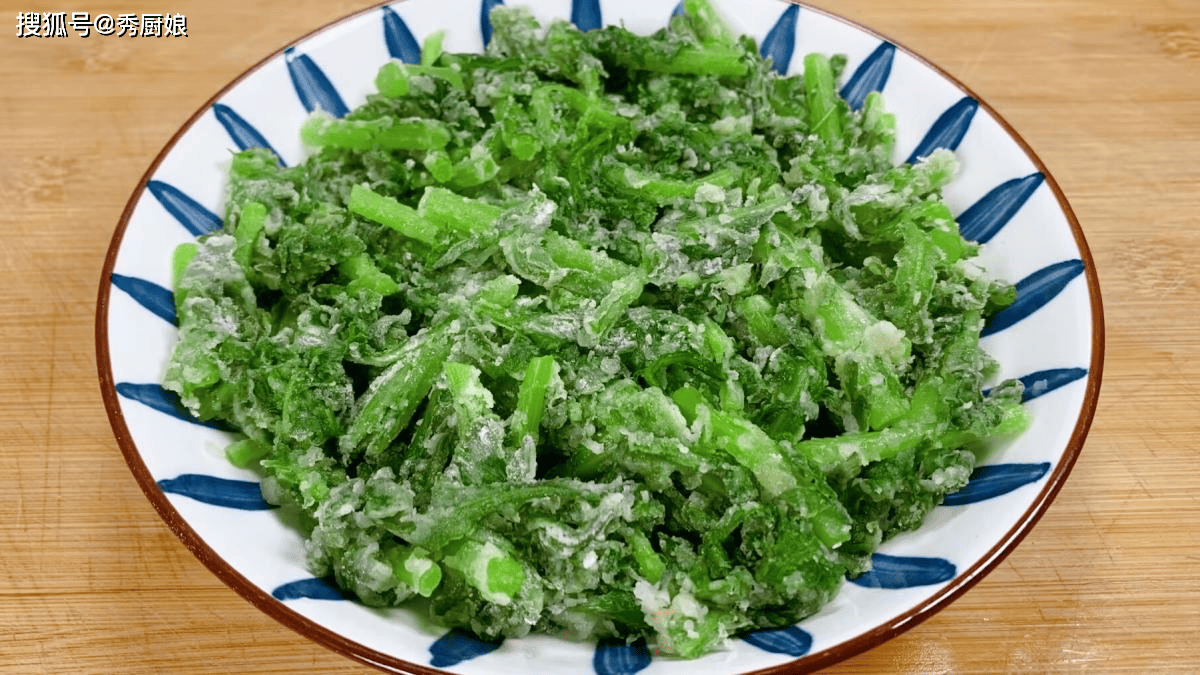 颠匀裹粉:少量多次加入玉米面粉和普通面粉(比例2:1),用手像“颠簸箕”一样颠动盆子,使每根茼蒿均匀裹上一层薄薄的粉衣。注意:粉衣要薄如蝉翼,仅需覆盖表面即可,过多会导致口感发面、失去茼蒿本身的清香。
