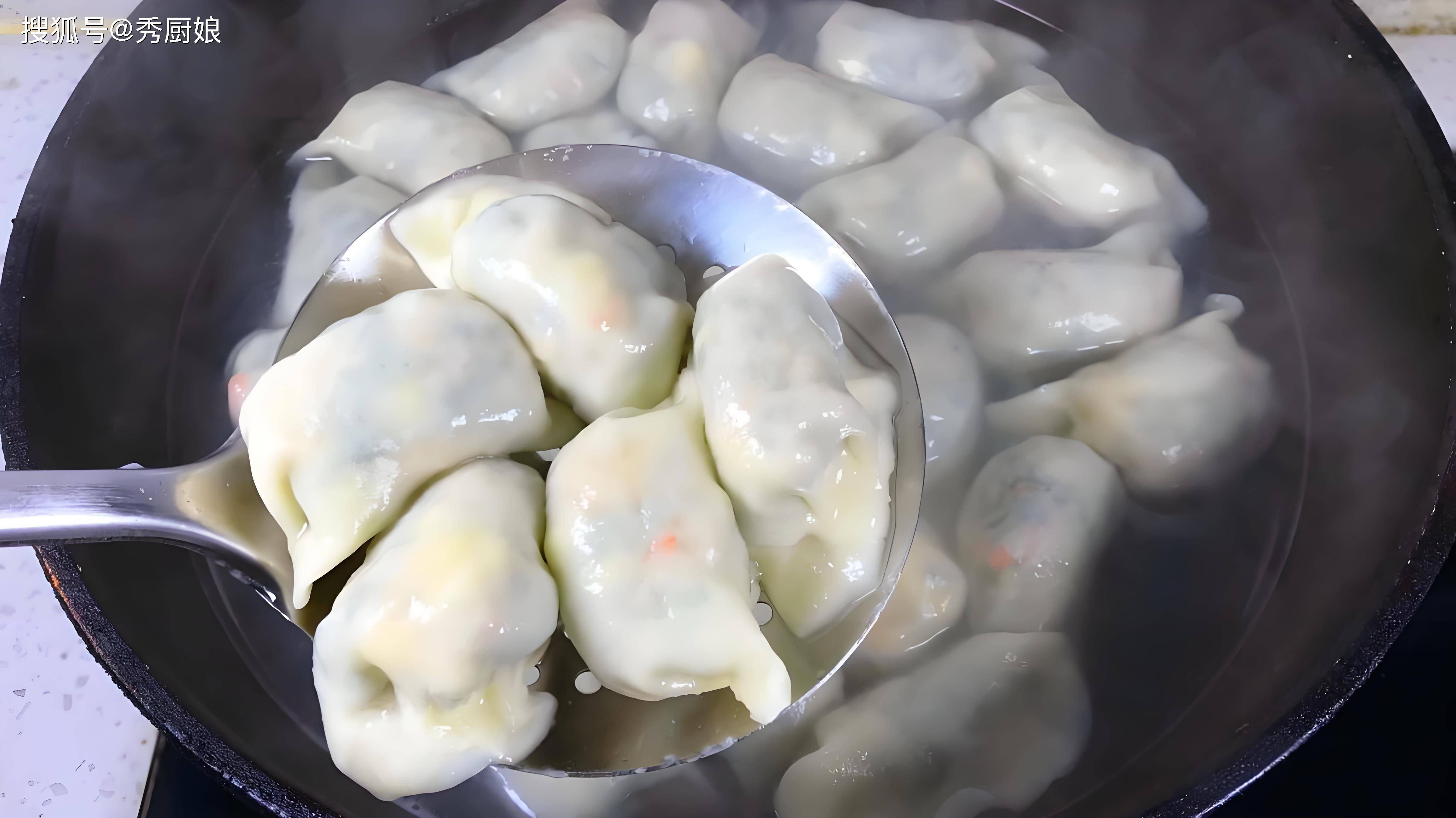 3. 水开后点入半碗凉水,重复三次(即“三点水”),饺子全部浮起、肚皮鼓鼓的就熟了。用漏勺捞出,装盘上桌!