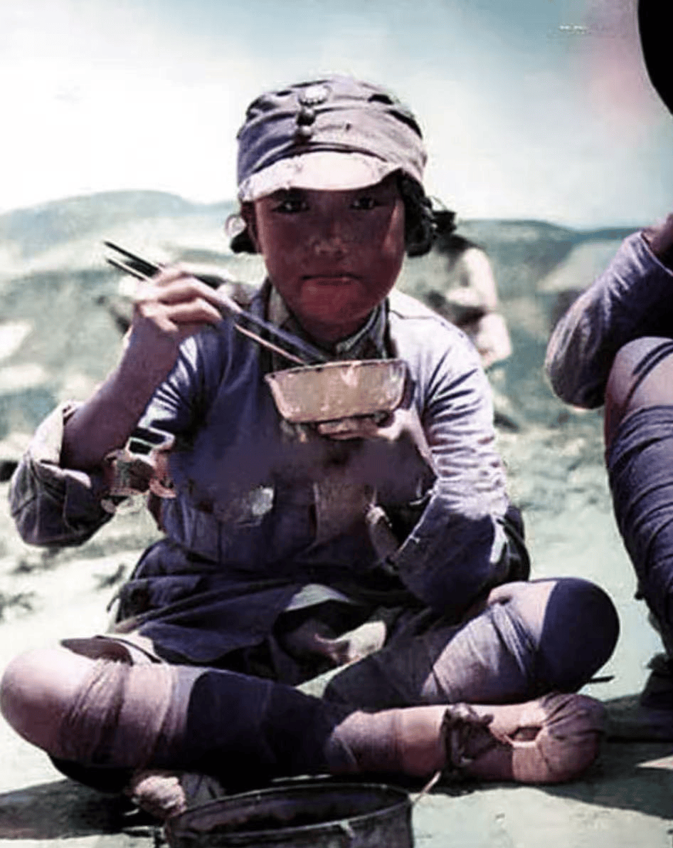 战场上可没有什么男女之分,女兵们和男兵一样拼,这张照片,她们席地而坐,端着小碗吃饭,看向镜头时脸上还挂着笑,估计是苦中找点乐子。