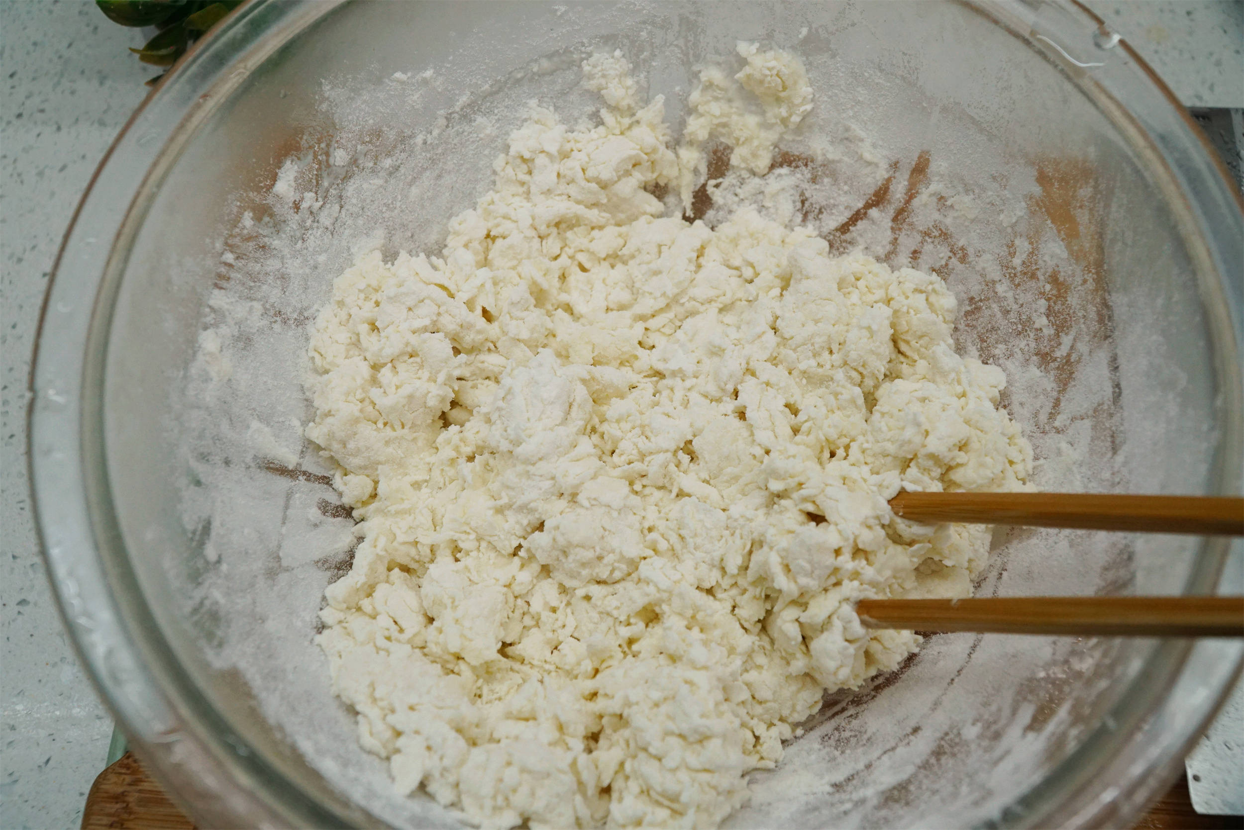 面粉加盐,倒入滚烫开水,边倒边搅拌成面絮。