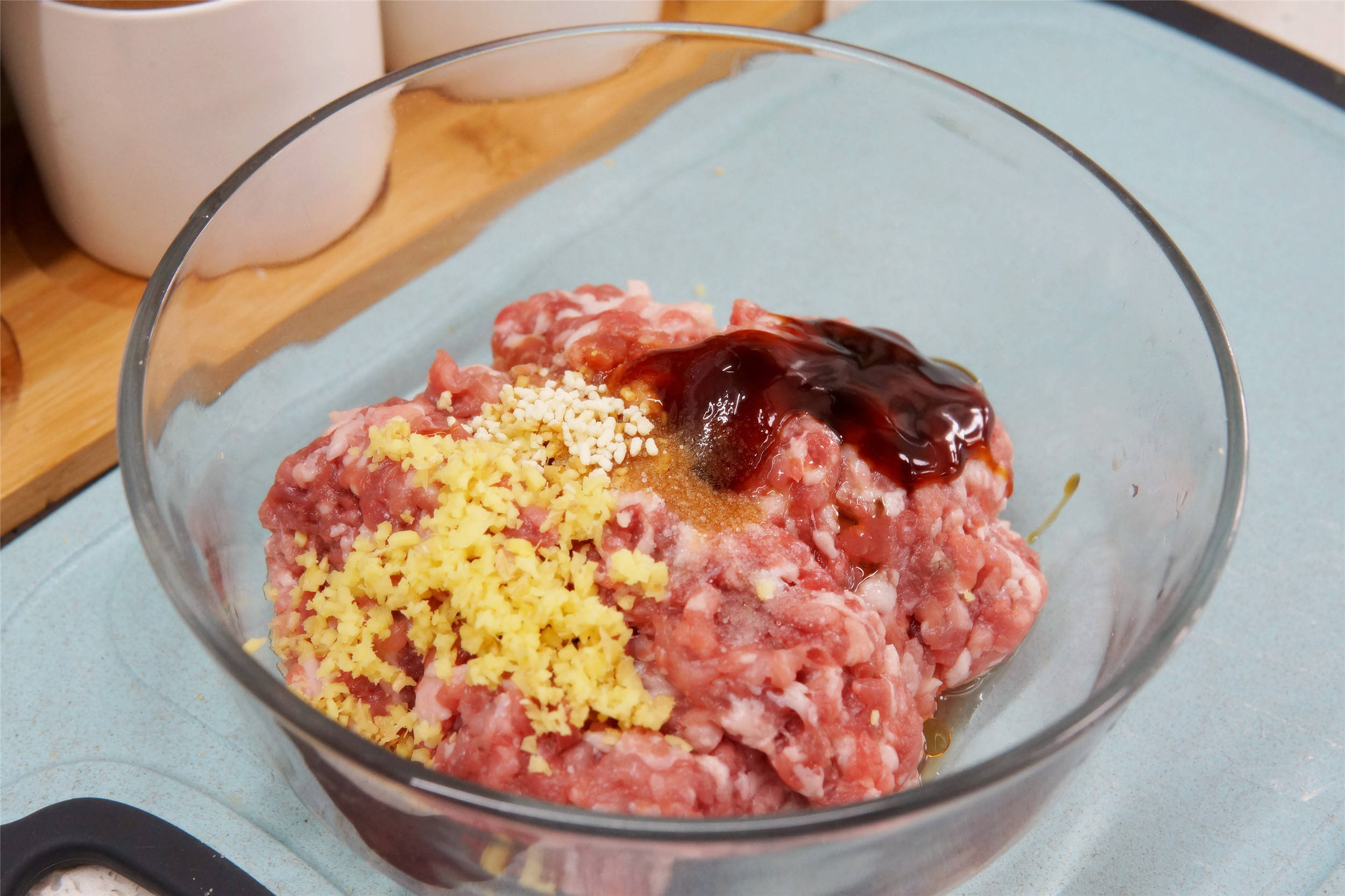 姜切末,加入肉馅中,再加盐、鸡精、蚝油、生抽、香油,搅拌均匀后腌制10分钟。