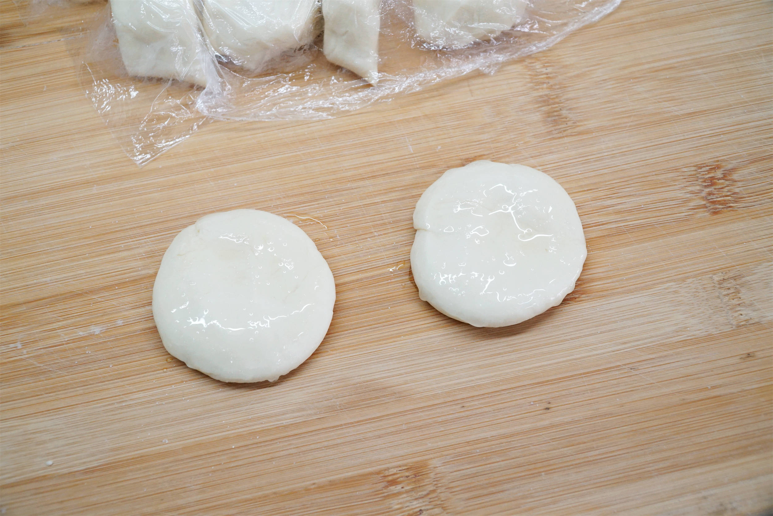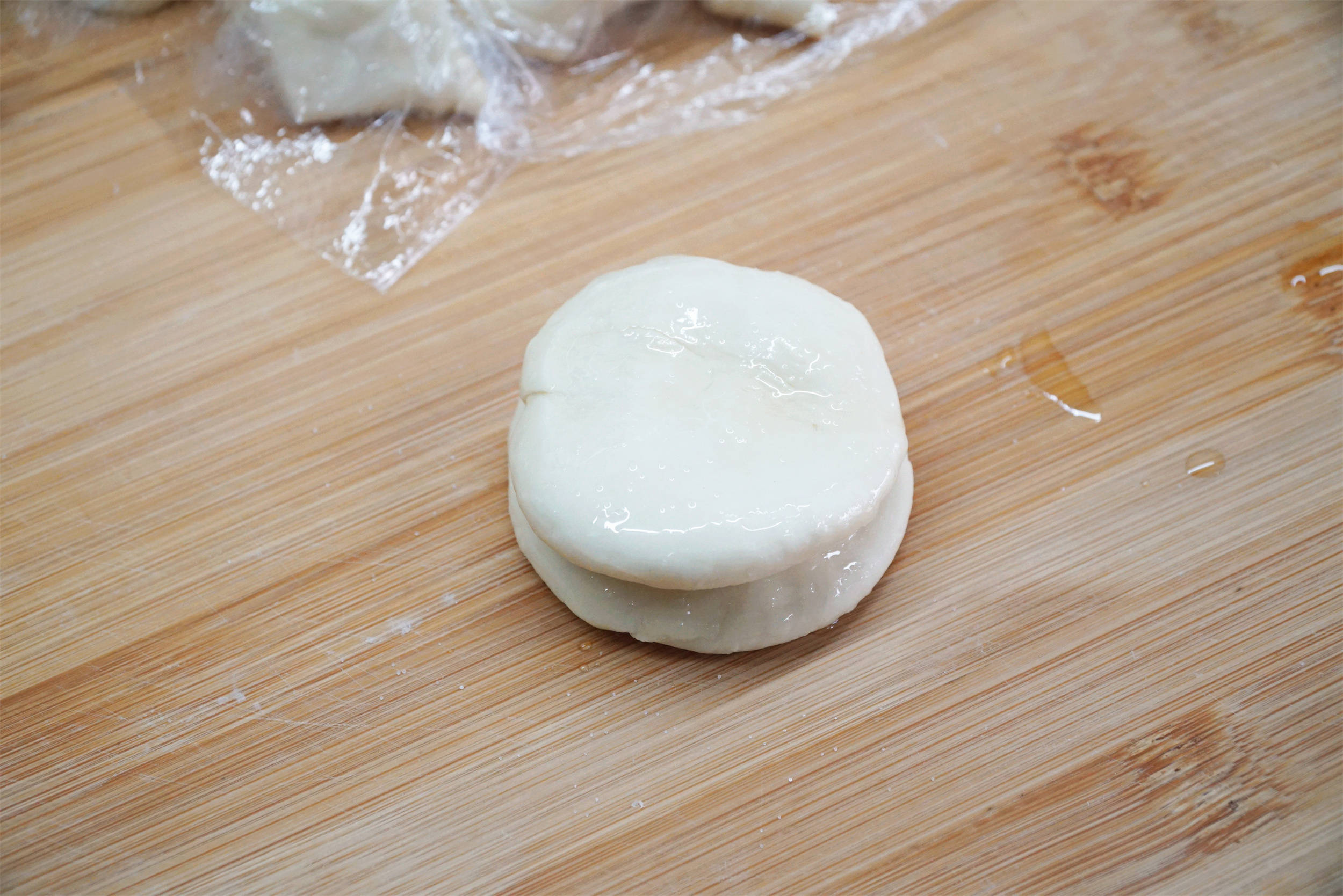4.把两个刷好油、撒好盐的圆面饼叠放在一起,用擀面杖擀成薄薄的圆饼。