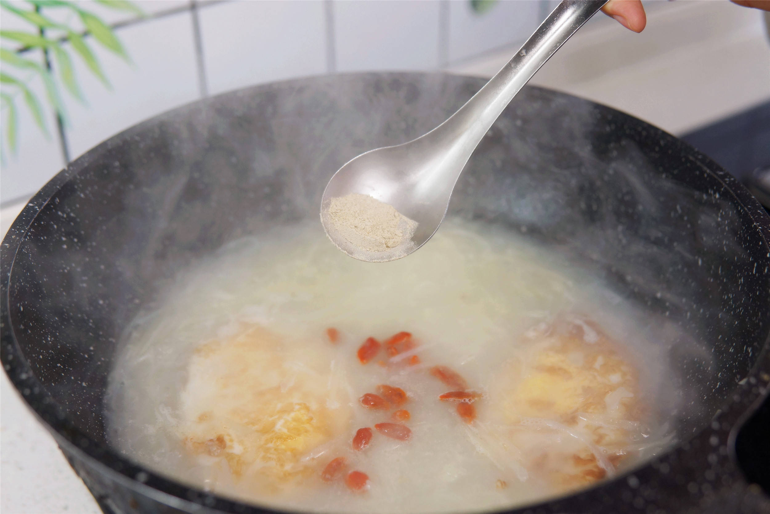 加入枸杞、胡椒粉、盐、鸡精,撒葱花点缀。
