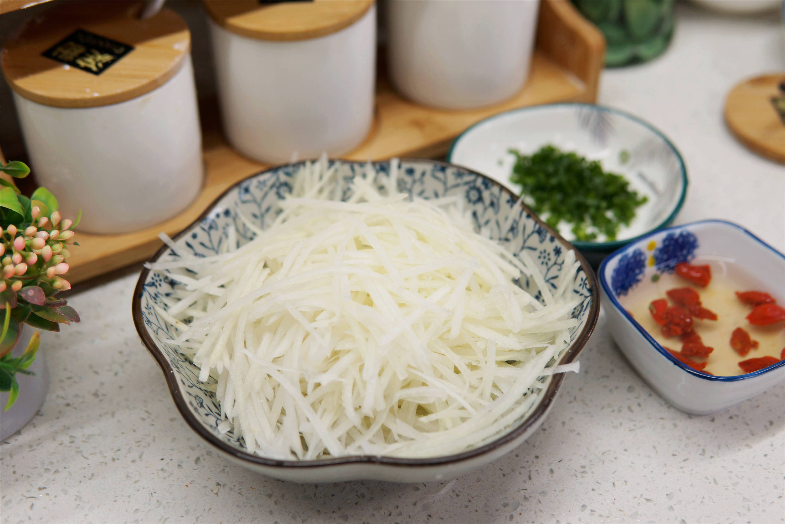 1. 萝卜清洗干净,去皮切成细丝;小葱清理干净切成圈;枸杞放入清水中浸泡10分钟,捞出沥干备用。