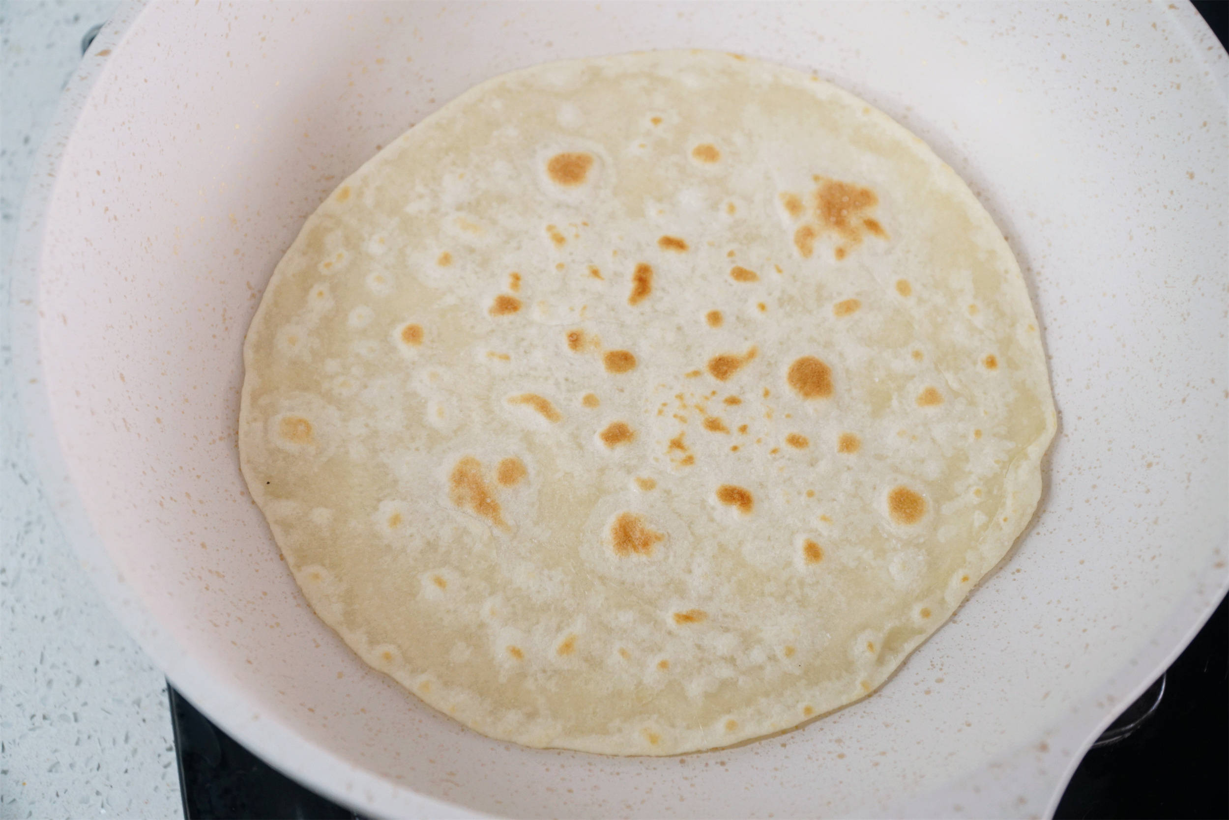 平底锅烧至四五成热,放入薄饼,中小火慢烙至两面微黄、中心鼓起。