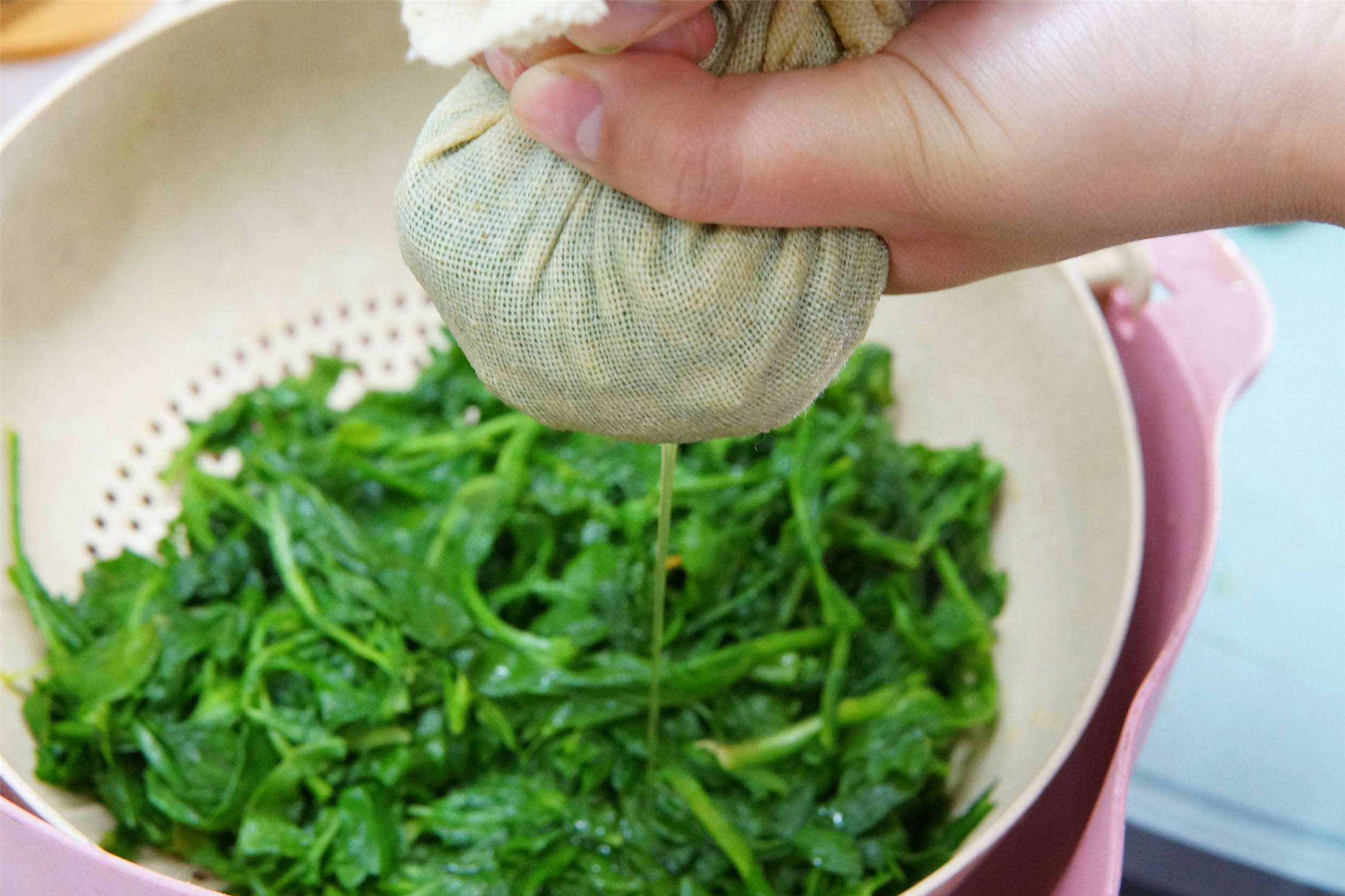 2. 锅中加入适量的水,水烧开后将荠菜放入焯水1分钟,捞出沥干水分;为防止荠菜水分太多不好包,可用纱布包裹荠菜,轻轻挤干水分(挤水时别太用力,避免流失鲜味)。