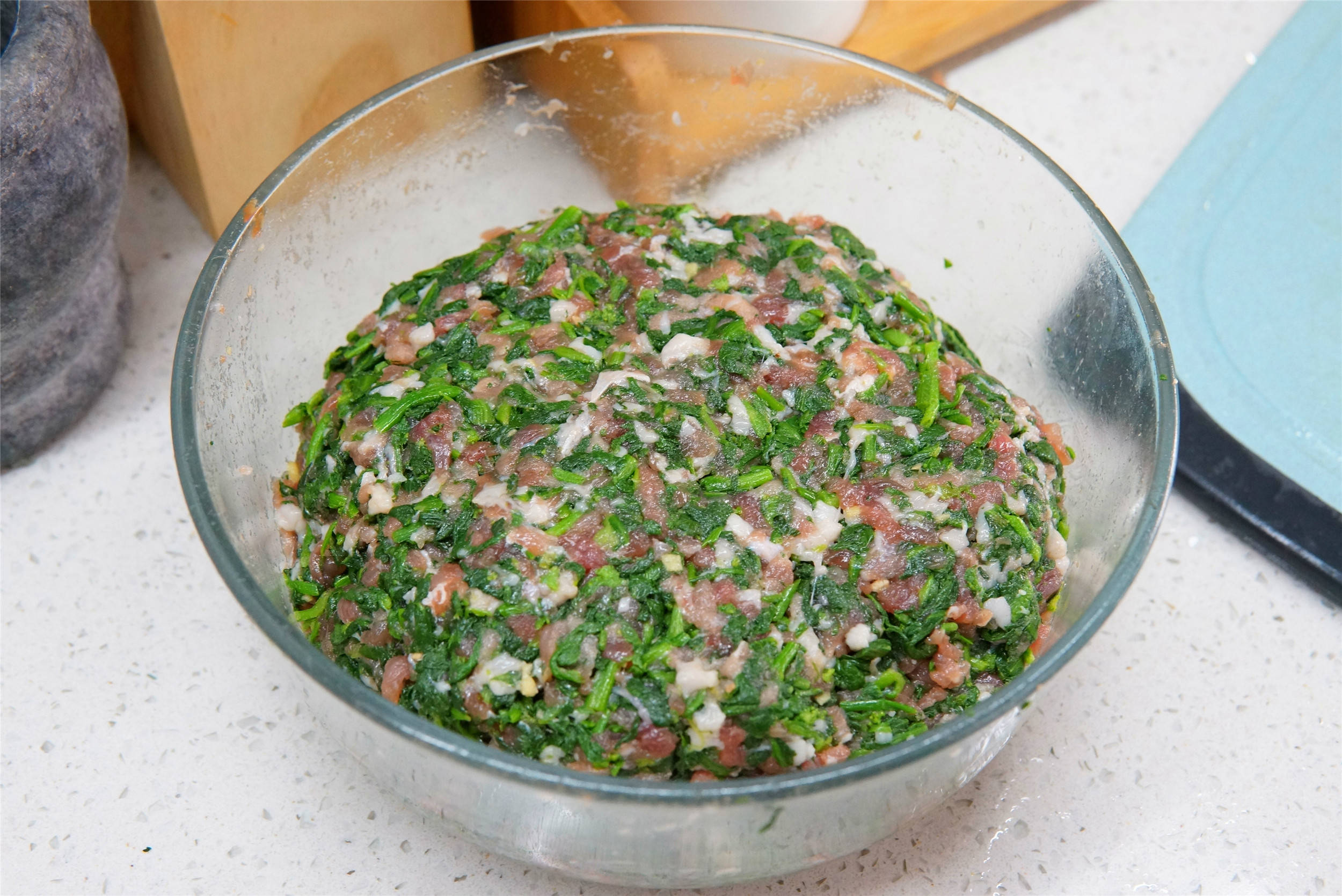 荠菜切碎,与肉馅混合,加1勺植物油拌匀(口感更温润)。