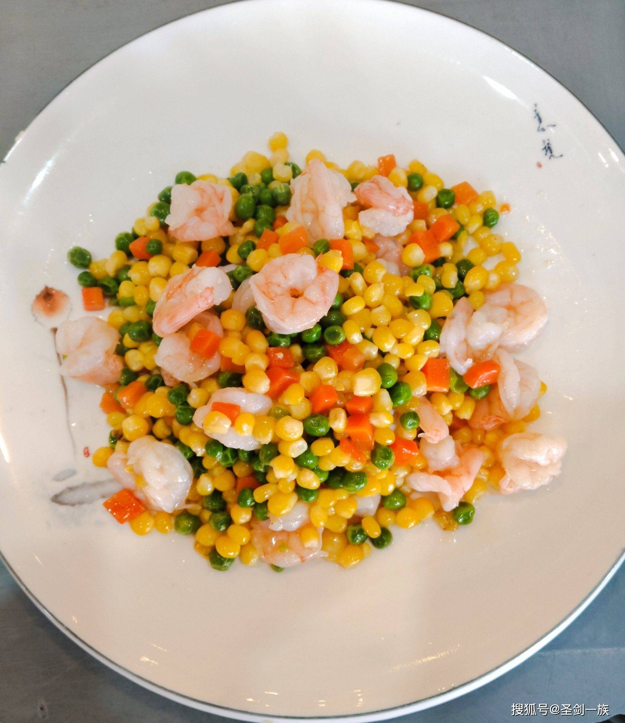 食材:玉米、虾仁、胡萝卜、青豆、姜片、盐、料酒、淀粉