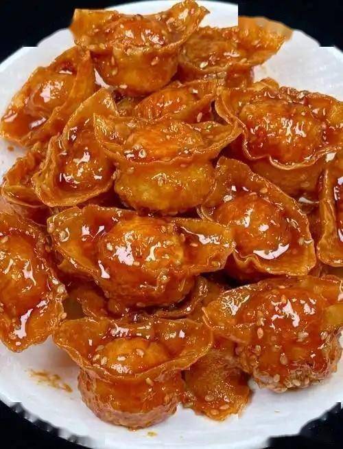 6. 锅留少许底油,倒入酱汁,小火煮至冒泡、略微浓稠。倒入炸好的元宝,快速翻炒均匀裹上酱汁,出锅撒上白芝麻即可。