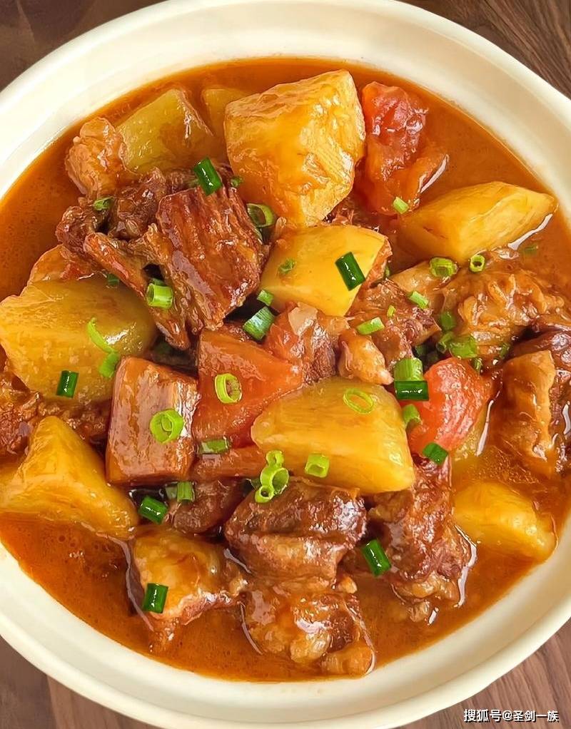 4. 加入配菜:一小时后,加入切滚刀块的土豆和剩下的番茄块,根据口味加盐。继续炖煮20-30分钟,直到土豆软烂、汤汁浓郁。出锅前可以撒点葱花,开动吧!