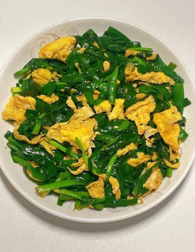 韭菜炒鸡蛋:韭菜与鸡蛋快炒,简单营养。