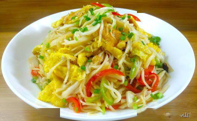 2. 蛋液炒成块盛出,茭白丝炒软后倒入鸡蛋,加盐调味,撒葱花。