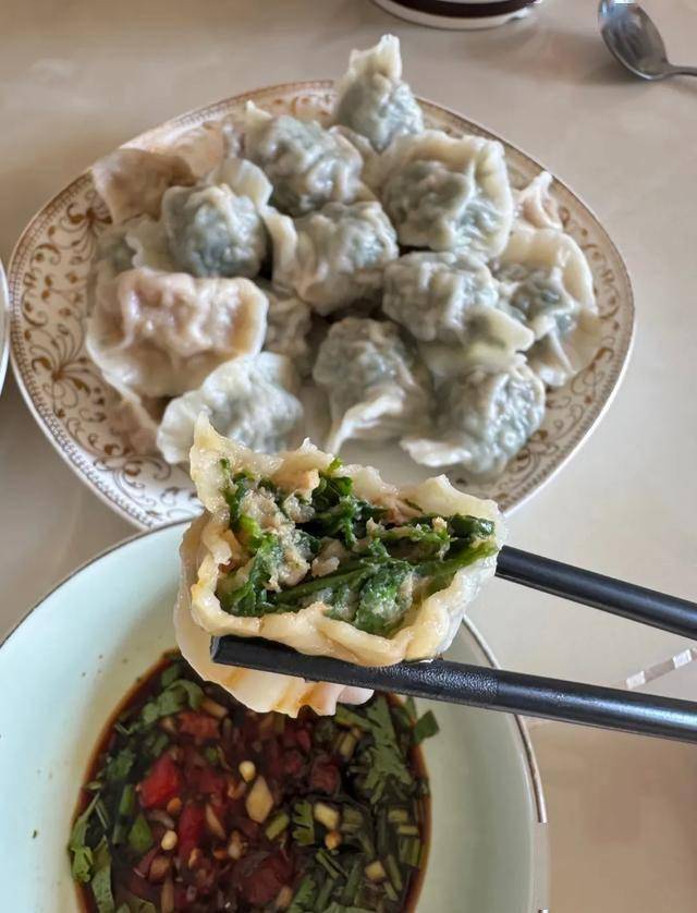 荠菜馄饨:荠菜与猪肉末混合包馅,汤汁清甜。