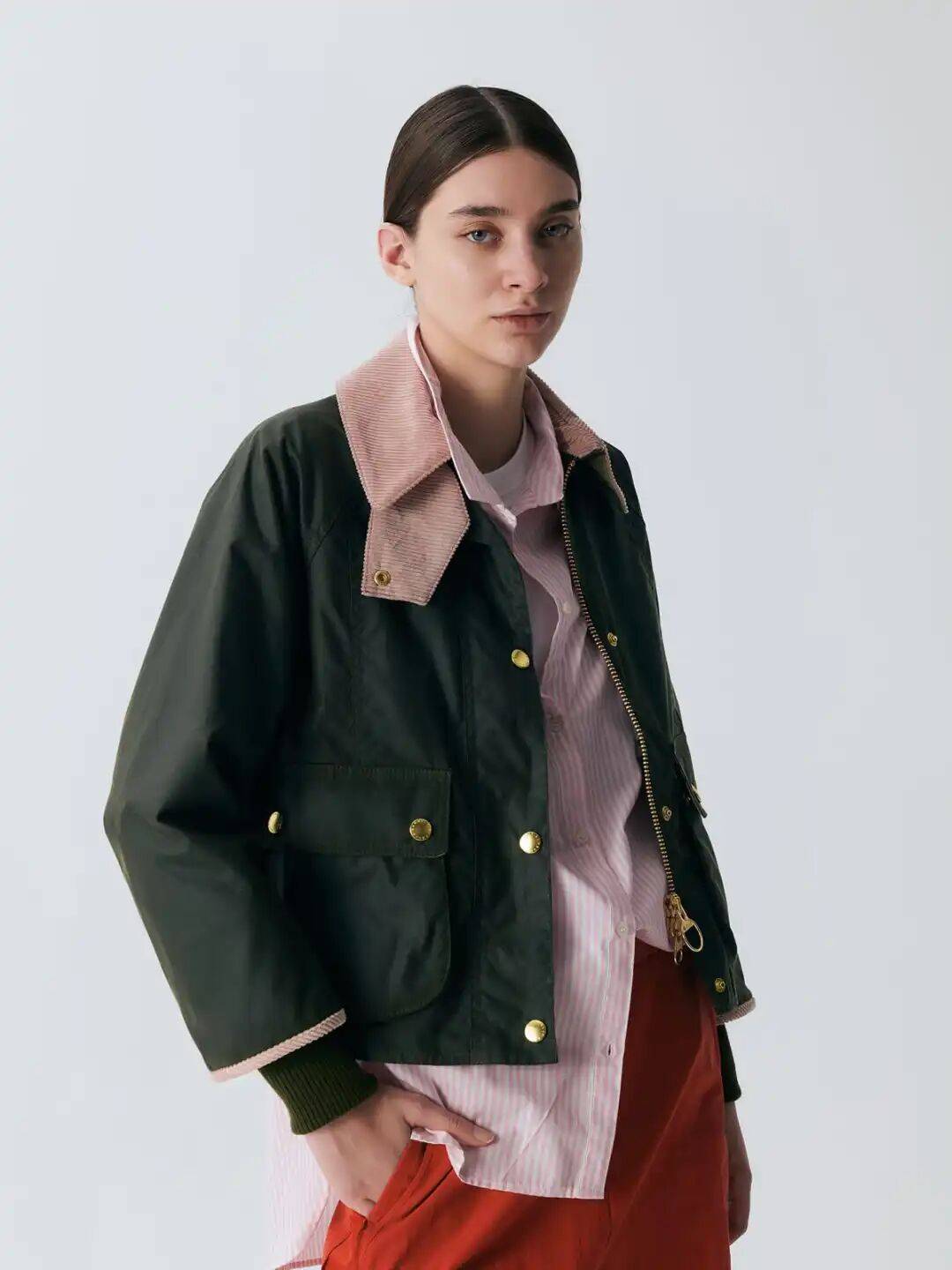2. 柔化Barbour夹克:选择Barbour的夹克,搭配连衣裙或短裙,这样的穿搭风格既保留了女性的特点,又增加了一点俏皮感。可以选择一些颜色较为鲜艳的裙子,以增加整体的色彩感。