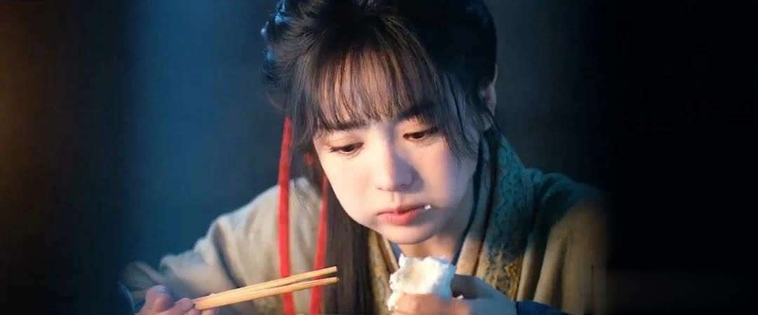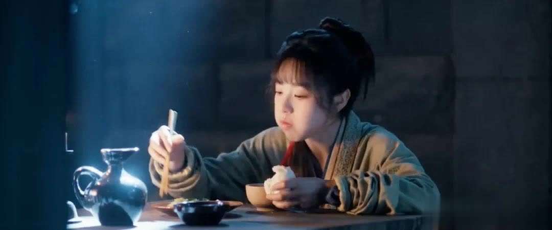 她的哭声,将寻找妹妹未果的疲惫、担忧和自责尽数揉碎。虽然镜头不长,却让观众清晰感受到她此刻的绝望与期待。在采石场与陶太傅的对话中,她提及谢征,手里捧着馒头,细嚼慢咽。吃到一半,眼中闪烁泪光,这是对谢征的惦念与思念,却无法明说。