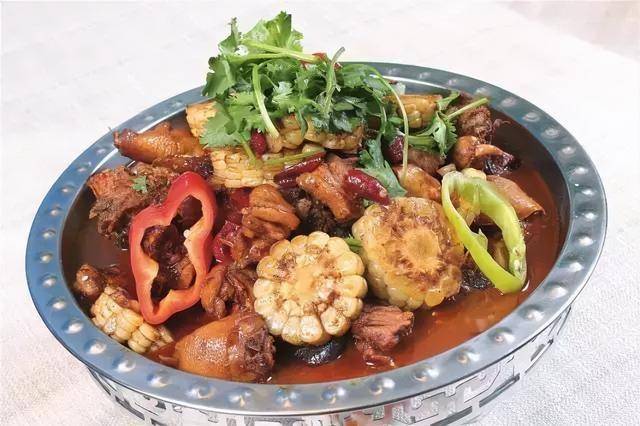 制作:锅入底油烧至七成热,下姜片、葱段、蒜粒、香叶煸香,下入秘制香辣酱、干辣椒段炒香后倒入鸡块,烹老抽调色,小火继续翻炒至五成熟,加入清水没过鸡块,调入糖色大火煮开,下香料粉、麻椒粉、鸡粉、盐,转小火炖5分钟,待鸡块断生后下入玉米段,小火继续炖8分钟,转中火收汁,至汤汁浓稠发亮、紧紧包裹鸡块,关火加盖焖半分钟,盛入平锅,撒上青、红辣椒圈、香菜即可点火上桌。