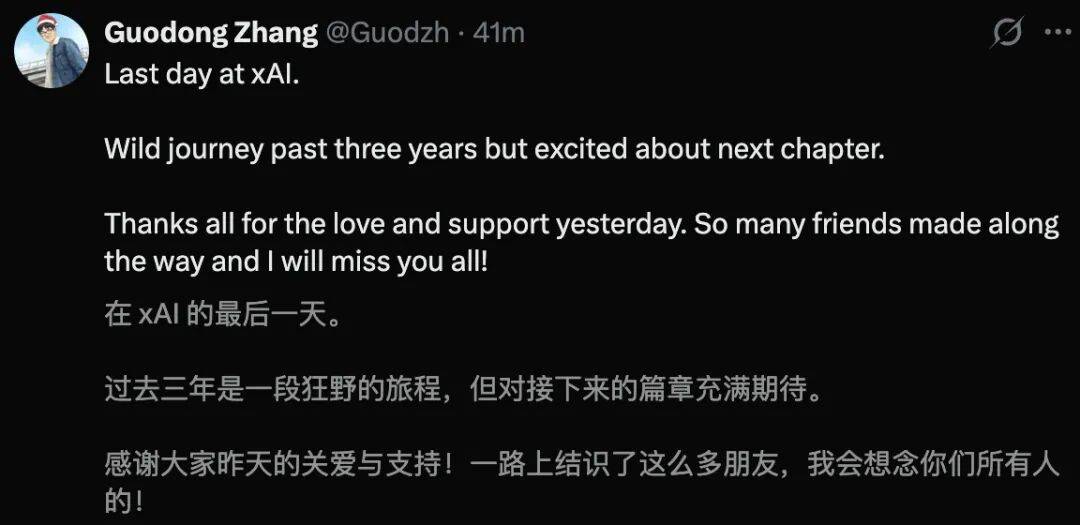 Jimmy Ba 2026年2月离职。 多伦多大学助理教授,Hinton的亲传弟子。 Jimmy Ba曾主导大量xAI的运营工作,是创始团队里少有的既懂学术又懂管理的人。 离职时,他写下:「是时候重新校准我对大局的梯度了。2026年将是疯狂的一年,很可能是人类未来最繁忙、最关键的一年。」 戴子航(Zihang Dai) 2026年3月离职。 前谷歌研究科学家,卡内基梅隆大学计算机科学博士。 xAI的核心技术人员之一。 在共同创立xAI之前,他曾在谷歌工作,并在卡内基梅隆大学获得计算机科学博士学位。 张国栋(Guodong Zhang) 计划于近日正式离开。 至此,五位华人联创,已经几乎全部离开。 不只是华人,算上其他联创:曾在谷歌工作12年的Christian Szegedy,离开了; 谷歌六年的Toby Pohlen,离开了; 来自OpenAI的Igor Babuschkin和Kyle Kosic,离开了。 12位创始成员,如今只剩3人:前谷歌工程师Manuel Kroiss,和前特斯拉超算部门的Ross Nordeen,以及马斯克。 5位华人联创,已全部离开。 xAI已被SpaceX收购IPO在即,估值可能高达1.5万亿美元。 资本的逻辑只有一条:拿出成绩,快,更快;这也许不是最初那个追求「理解宇宙」的xAI所能承受的重量。 马斯克的应对,是他一贯的打法:换人,重建,空降新血。 只是重建之后的xAI,还会是当初那个xAI吗?会带来什么样的转变,还没有人能知道。 |