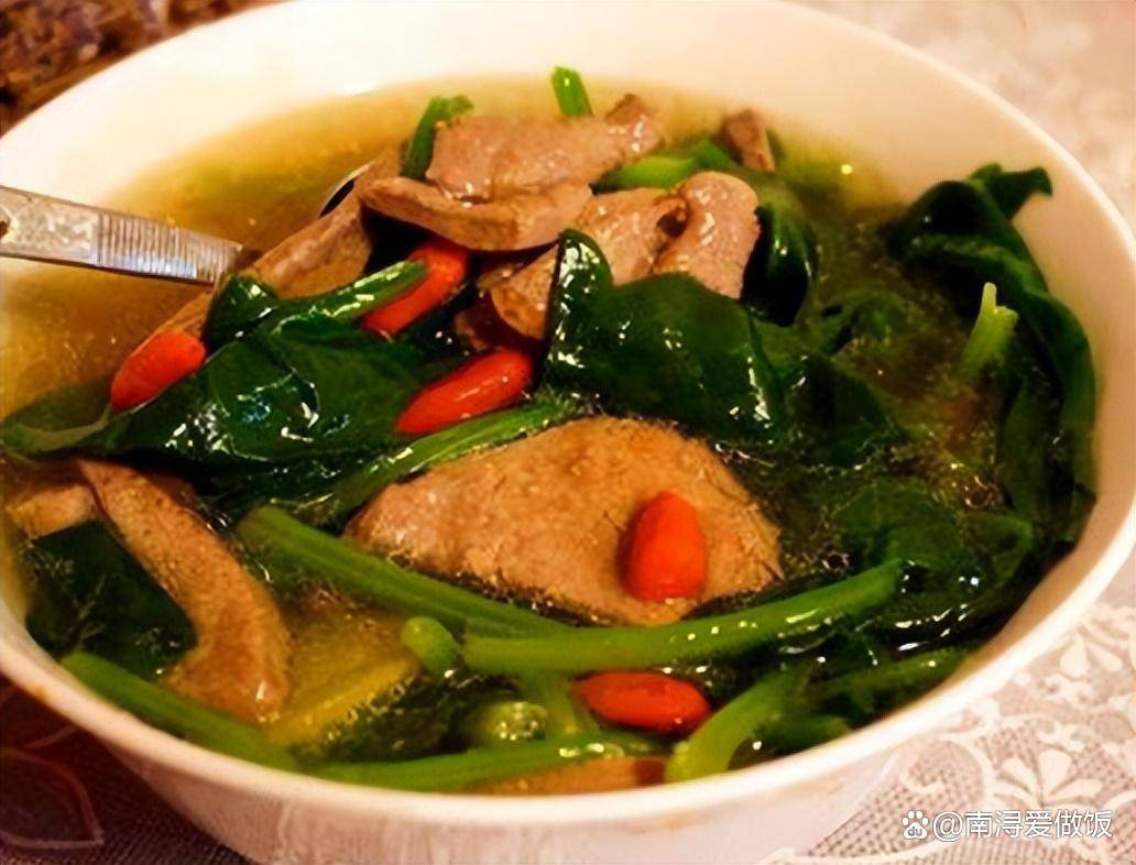 温馨提示: 1. 核桃仁小火慢炒才能激发香味,火大容易炒焦发苦。 2. 韭菜要分根部和叶子先后下锅,保证成熟度一致。 3. 这道菜要现炒现吃,放久了韭菜会出水影响口感。 三、菠菜猪肝汤 所需食材: 猪肝200克、菠菜300克、姜片5片、枸杞一小把、料酒2勺、淀粉2勺、盐适量、白胡椒粉少许、香油几滴、清水适量。